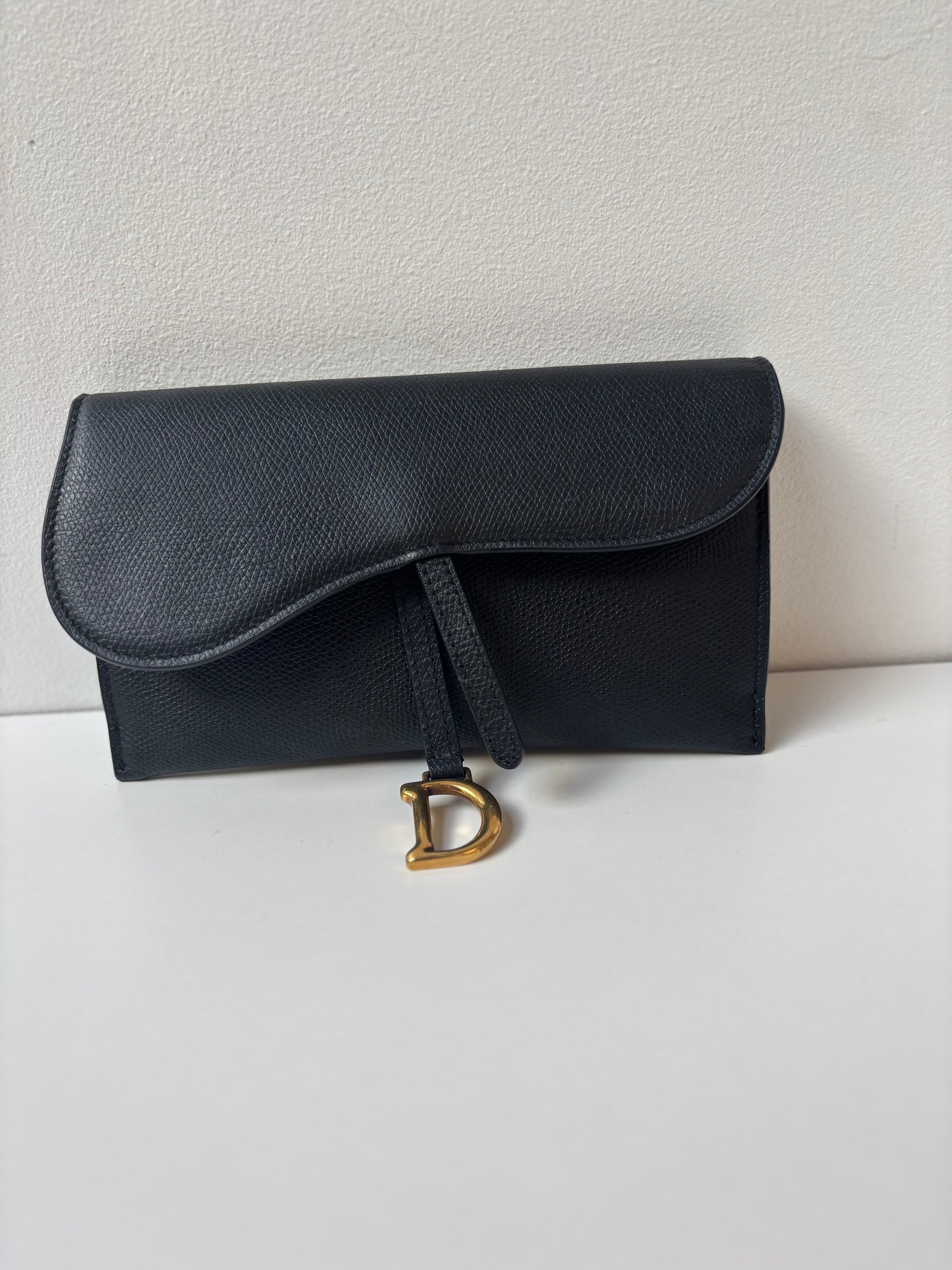 Perfect condition Dior saddle pouch in black grained leather. Arrives with gold cross body strap and original box.