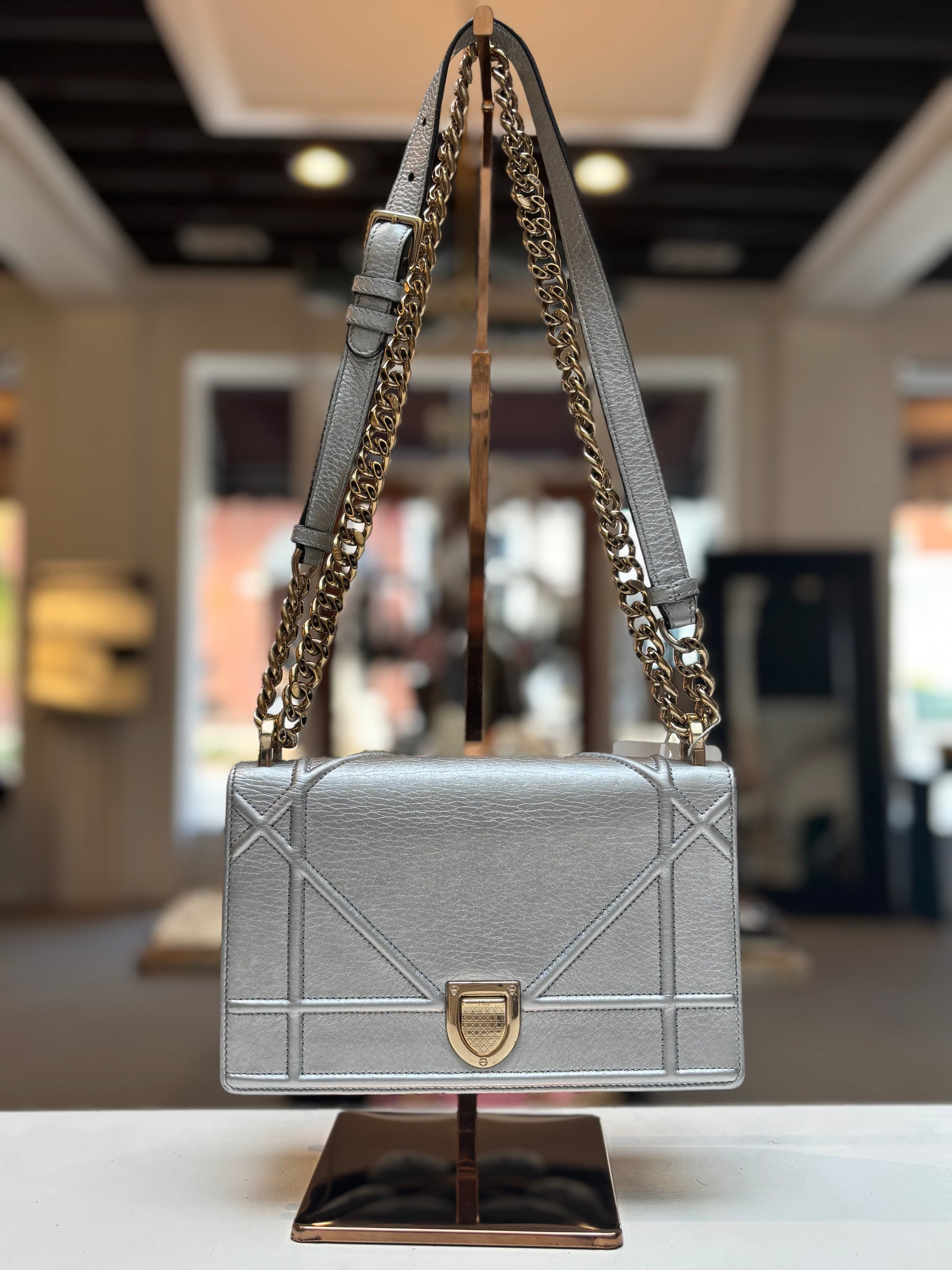 Beautiful silver Dior bag with brass chain. Fantastic condition. Comes with dustbag, certificate of authenticity