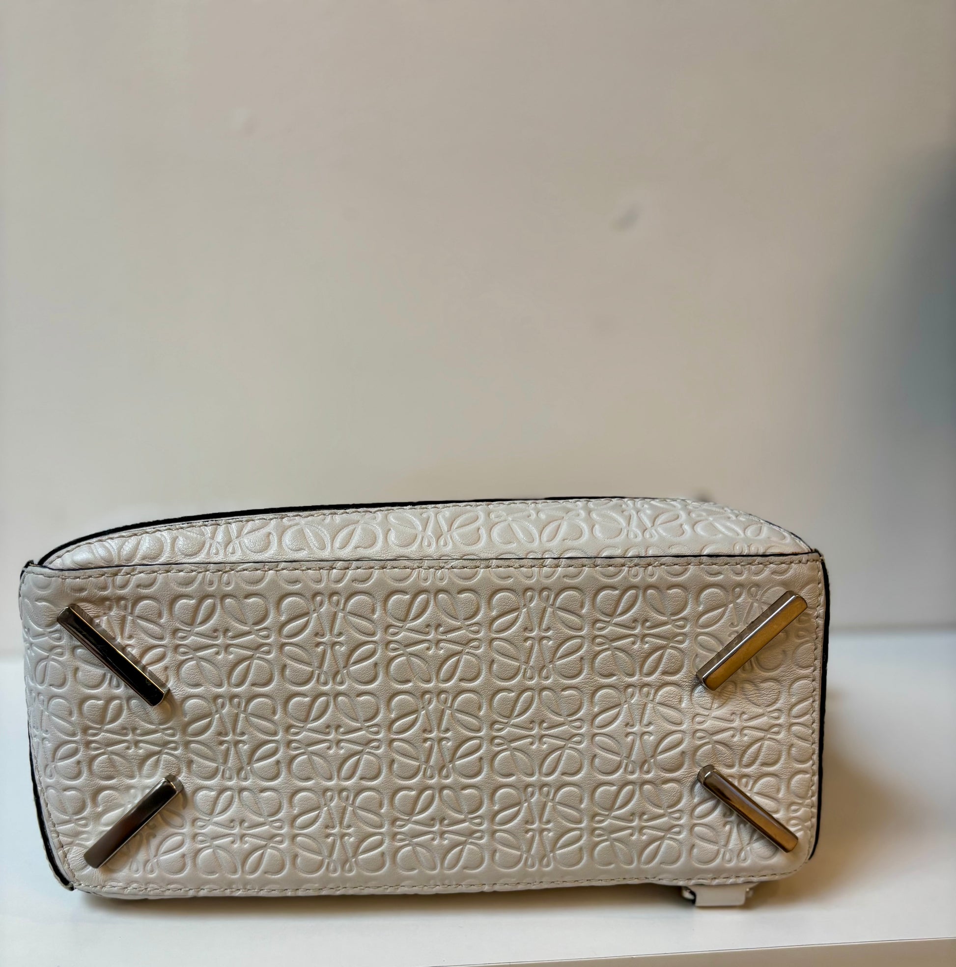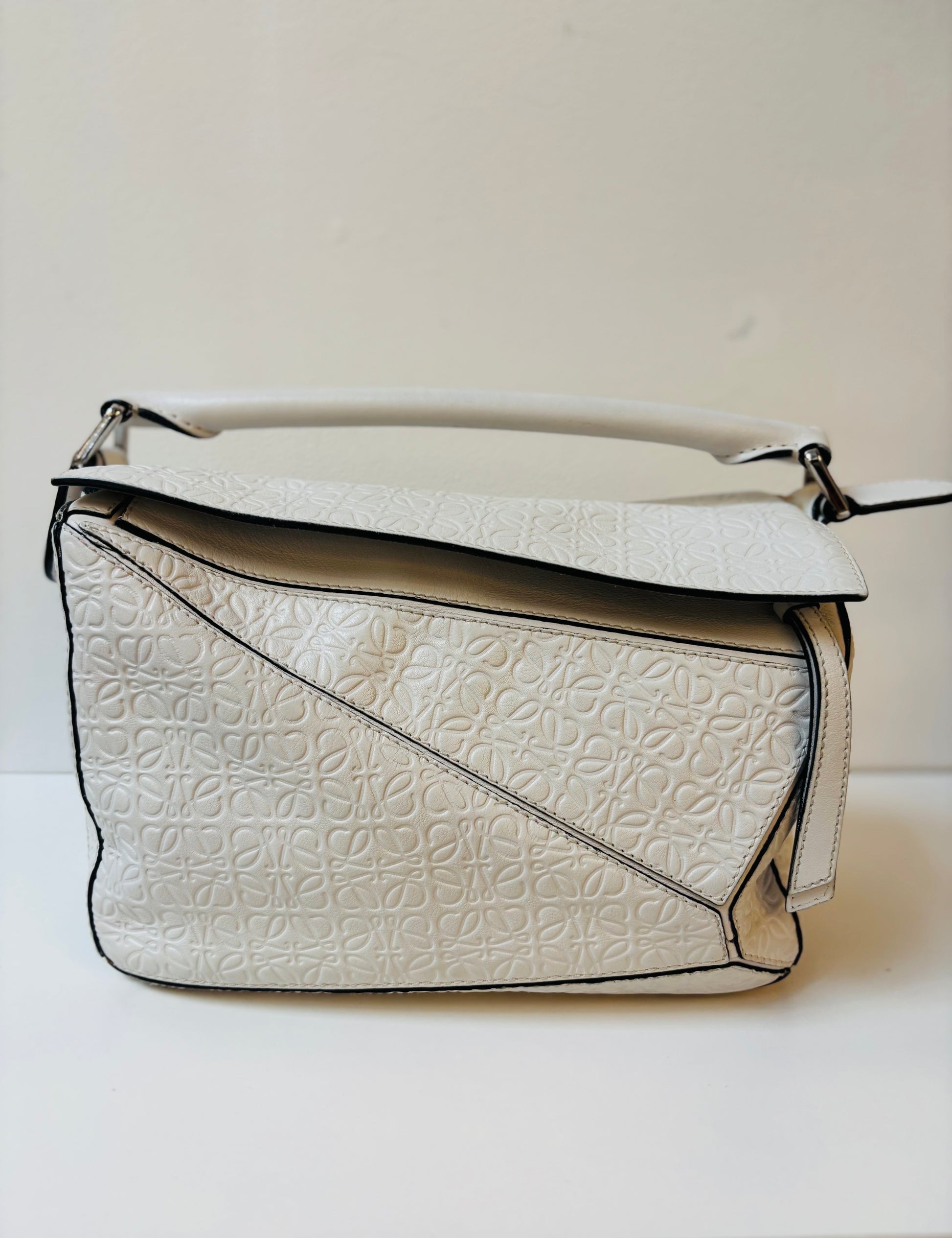 Incredibly unique Loewe Anagram Embossed Calfskin Puzzle bag in a creamy white. Great condition and comes with dust bag.