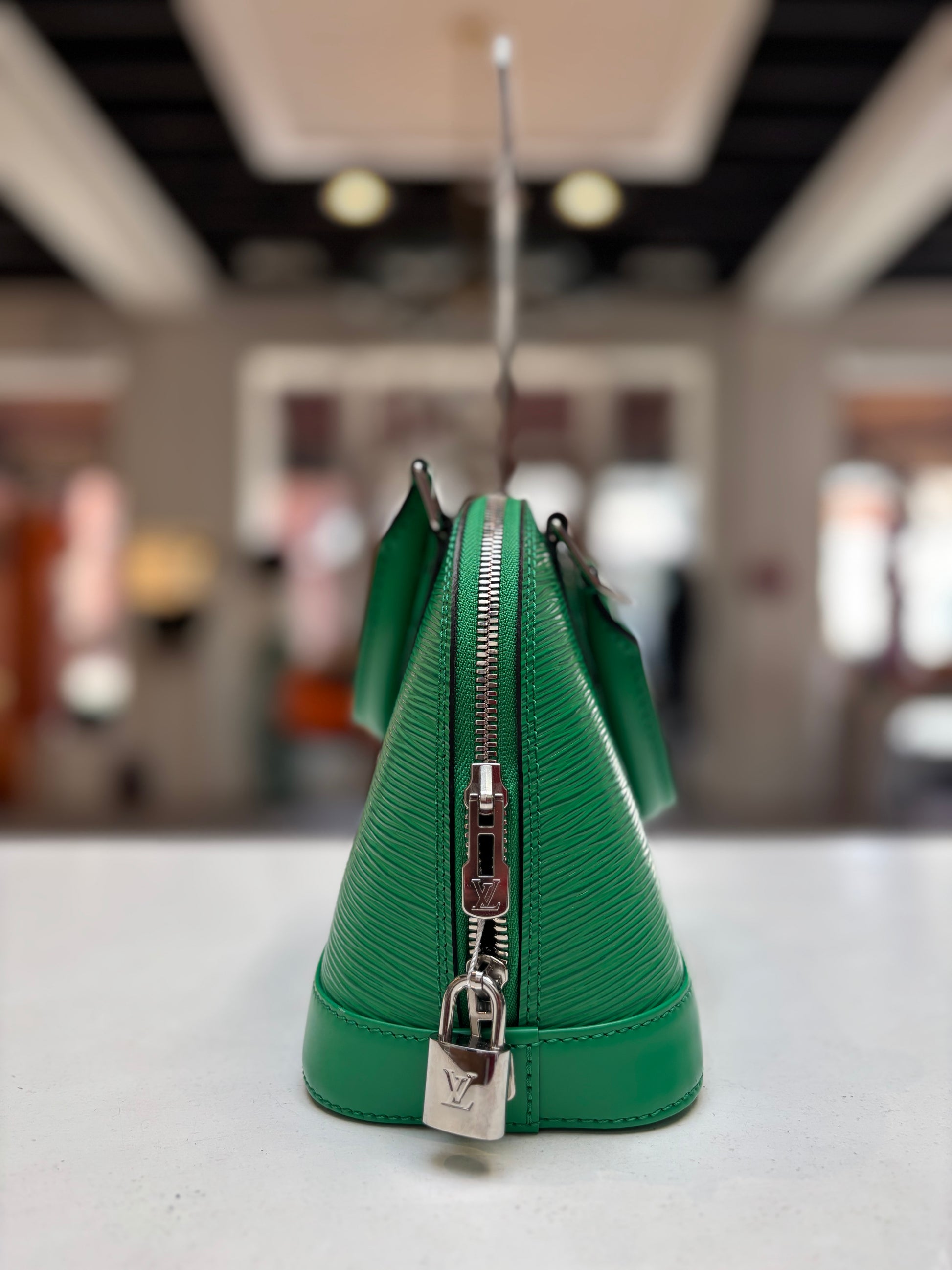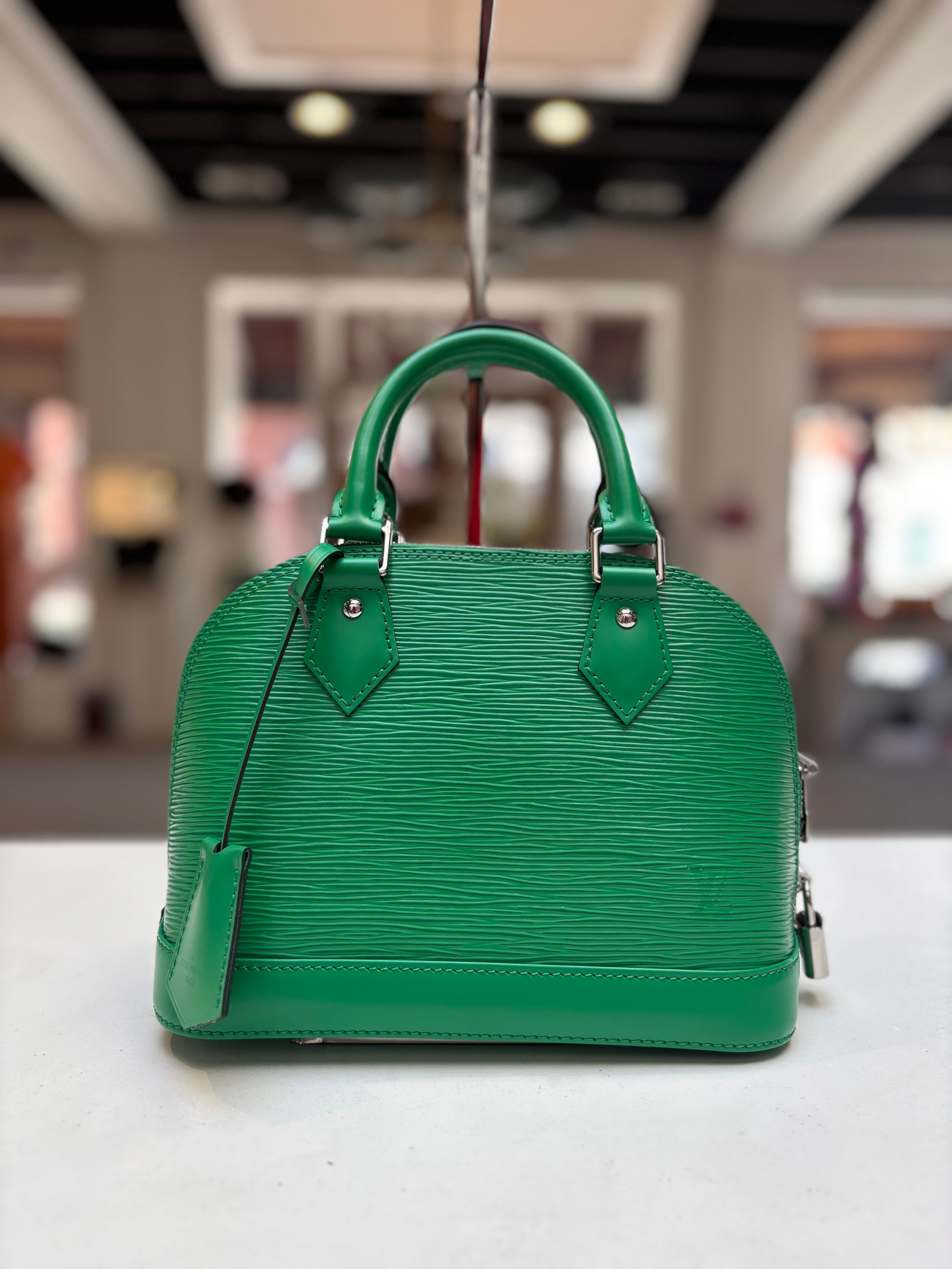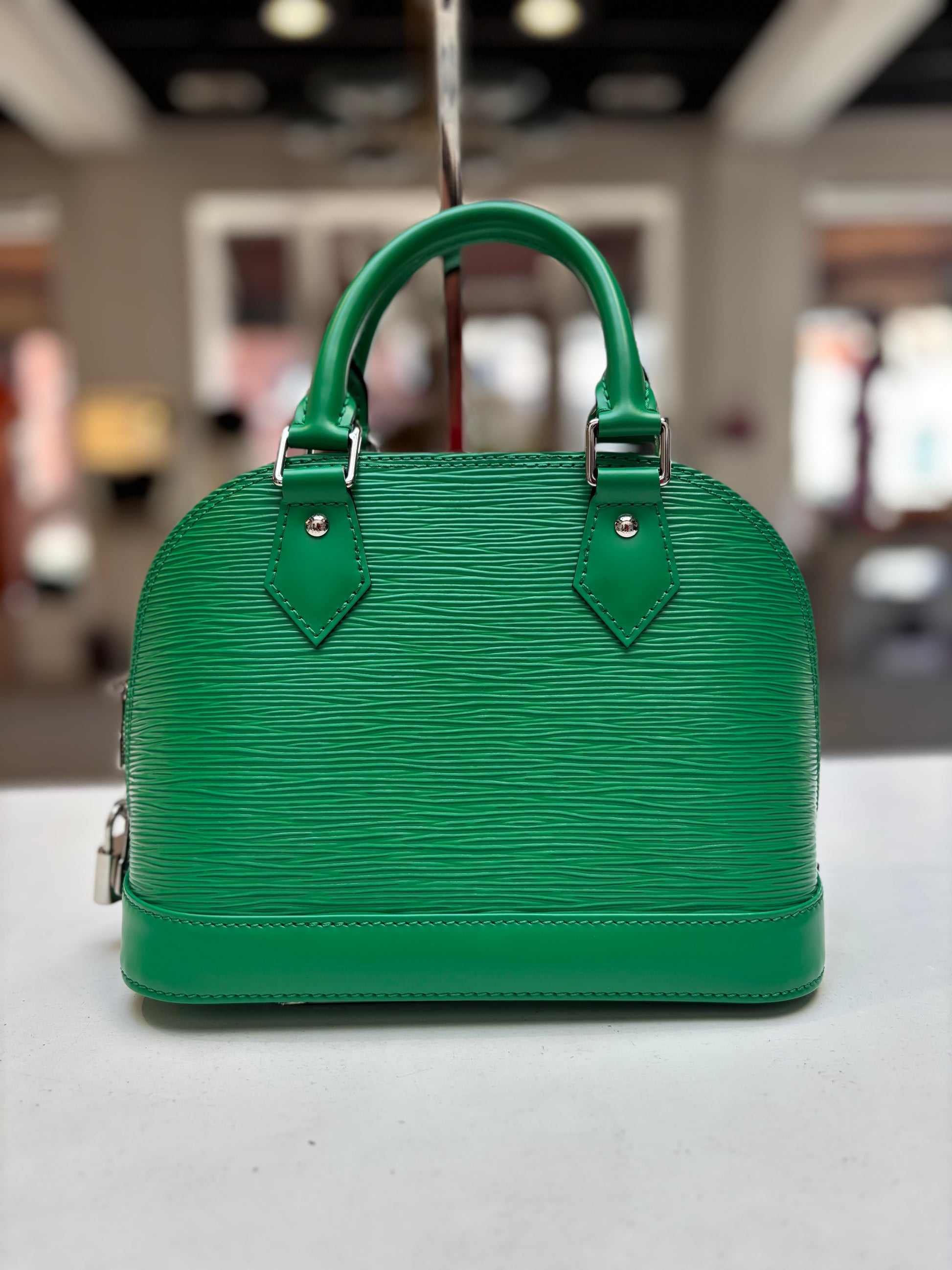 Absolutely stunning LV Alma BB in a gorgeous green leather. Interior is spotless. Arrives with dust bag and cross-body strap.