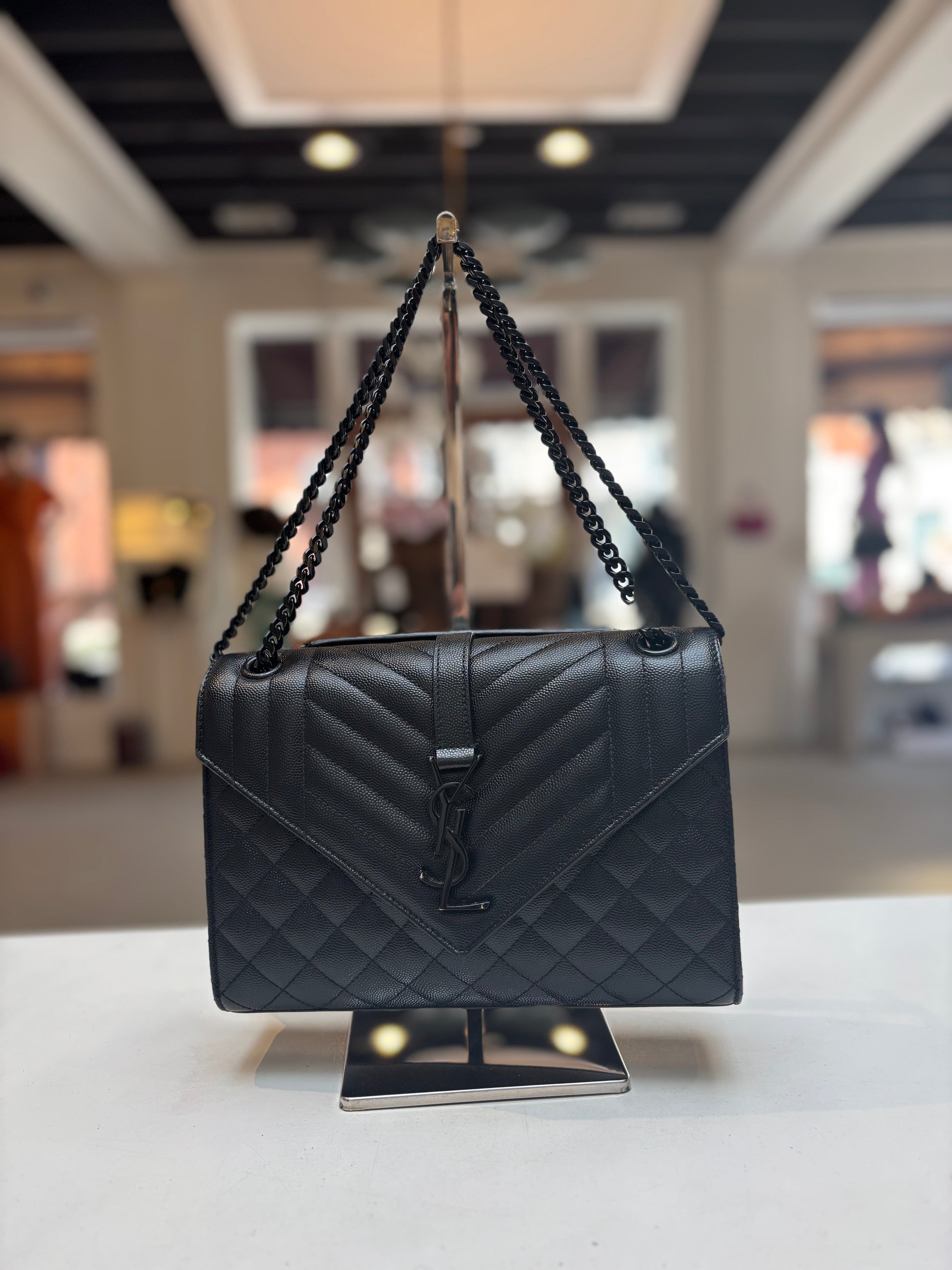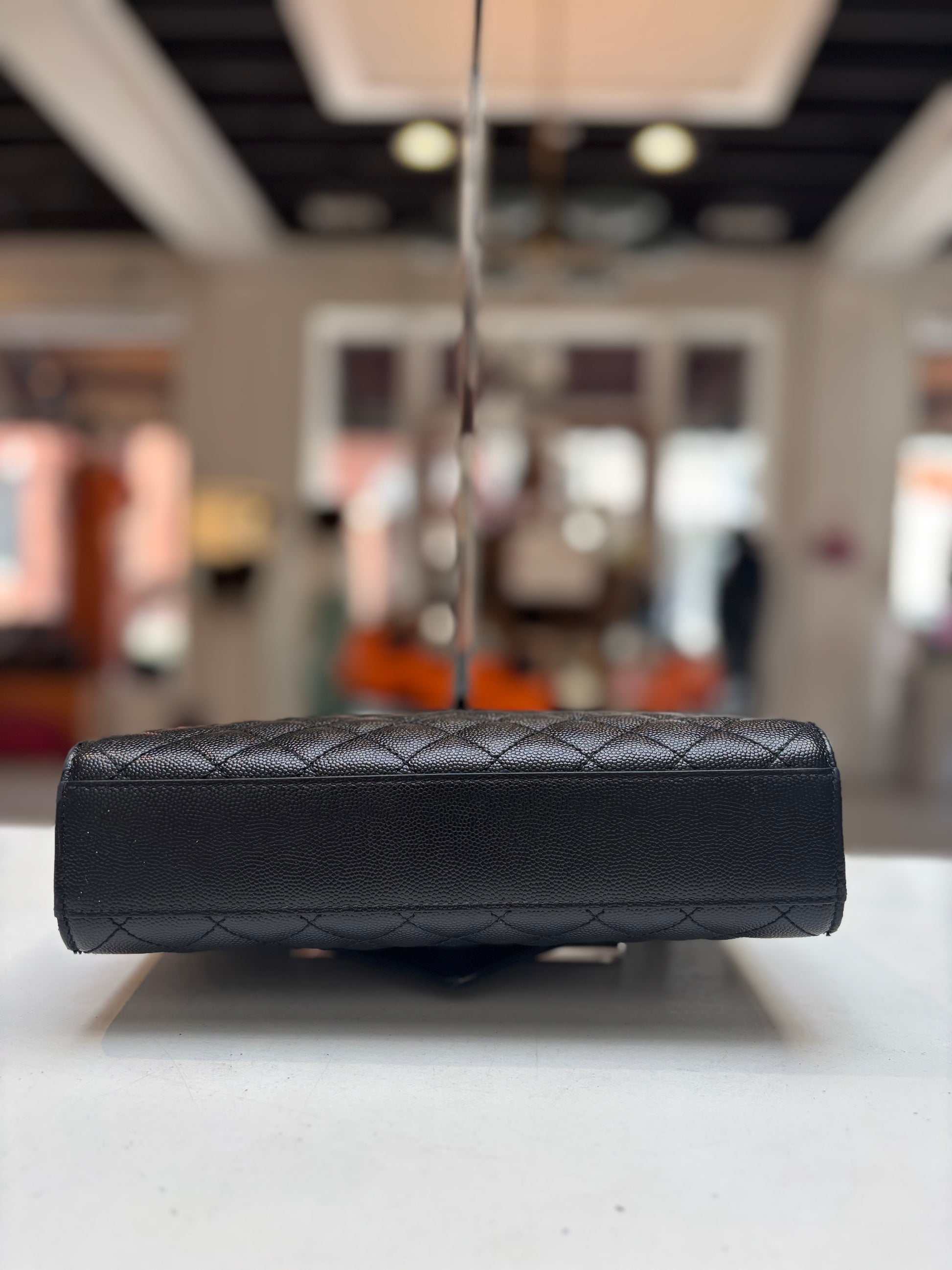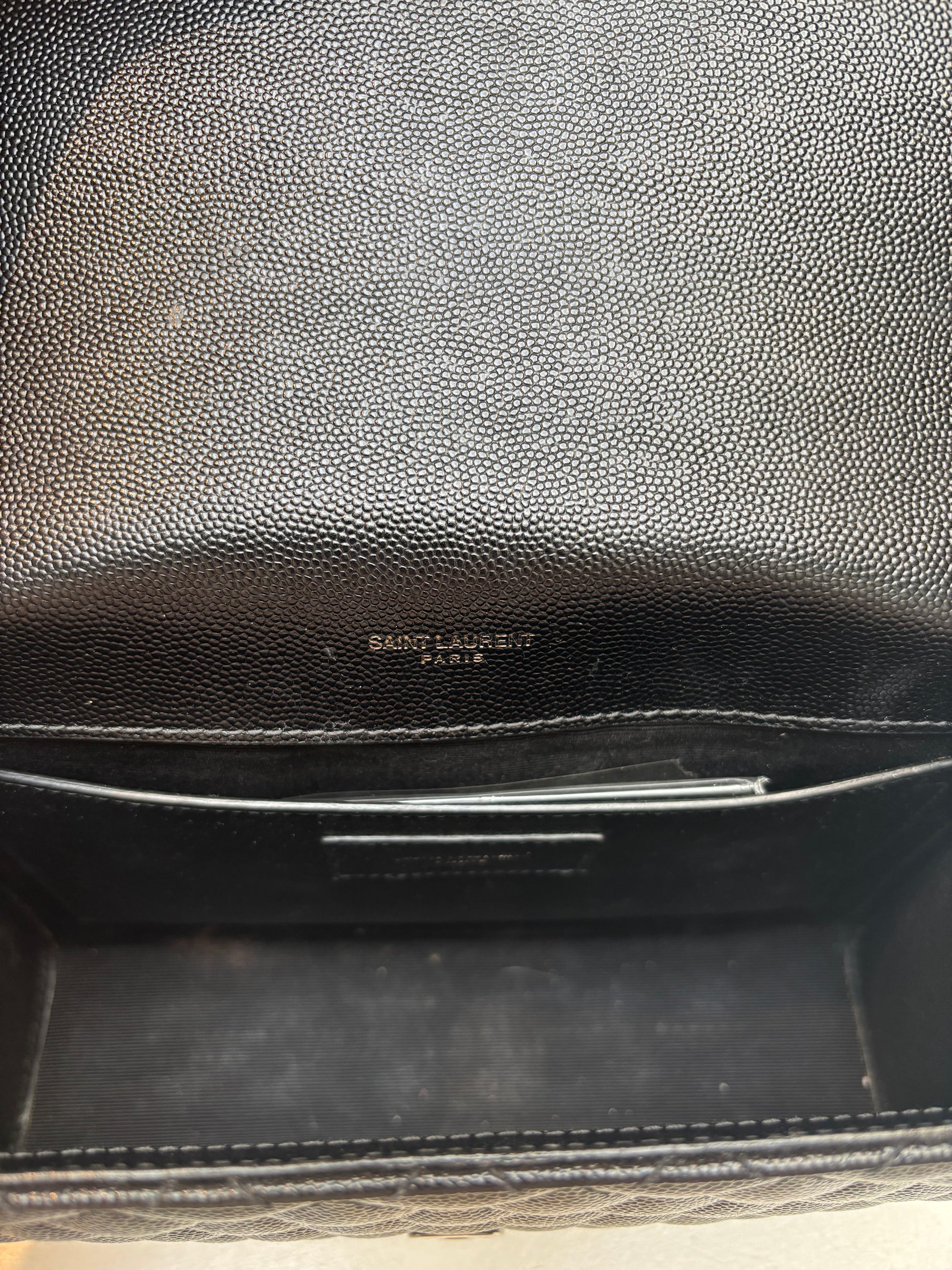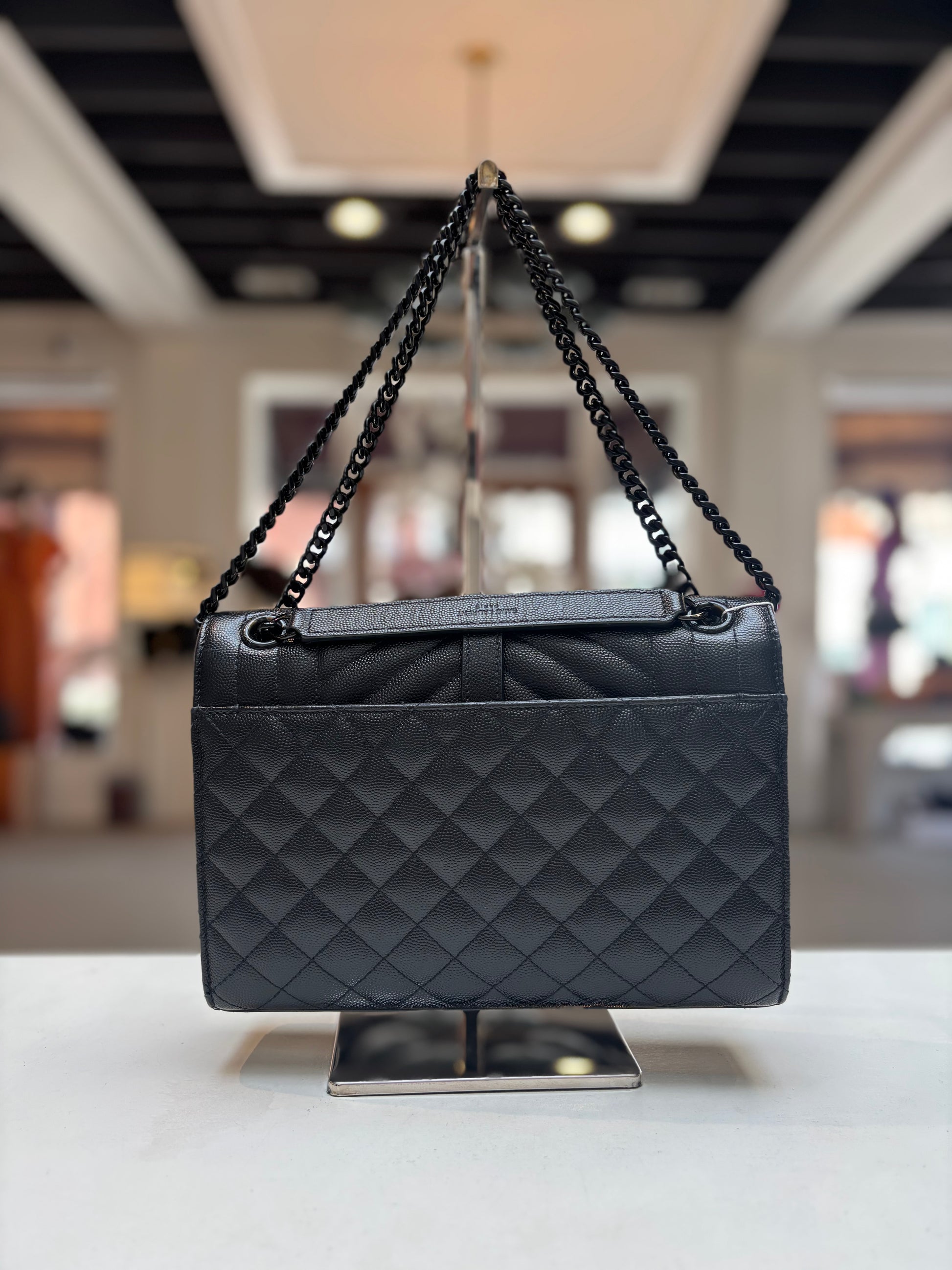 Excellent condition YSL Triquit Flap Bag in a grained black leather. The bag can be carried both as a shoulder bag and cross body bag. Arrives with dust bag.
